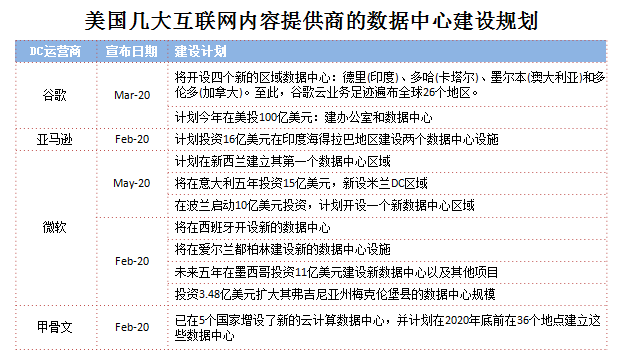 由此可見(jiàn),今明兩年,國(guó)外主要互聯(lián)網(wǎng)公司的資本開(kāi)支將呈現(xiàn)加速增長(zhǎng)趨勢(shì),尤其是在數(shù)據(jù)中心方面的投資。據(jù)ICC整理,進(jìn)入2020年以來(lái),谷歌、亞馬遜、微軟和甲骨文等公司已宣布了至少11項(xiàng)數(shù)據(jù)中心建設(shè)計(jì)劃。詳細(xì)如下: