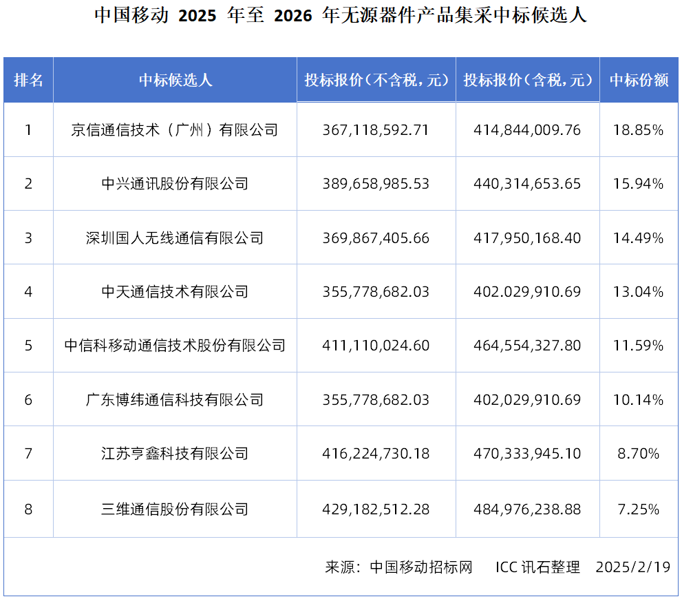 ICC訊 日前,中國移動于官網(wǎng)公示了2025年至2026年無源器件產(chǎn)品集中采購項目的中標(biāo)候選人。本次集采共吸引京信通信、中興通訊等8廠商入選中標(biāo),總中標(biāo)金額(含稅)超29.5億元。