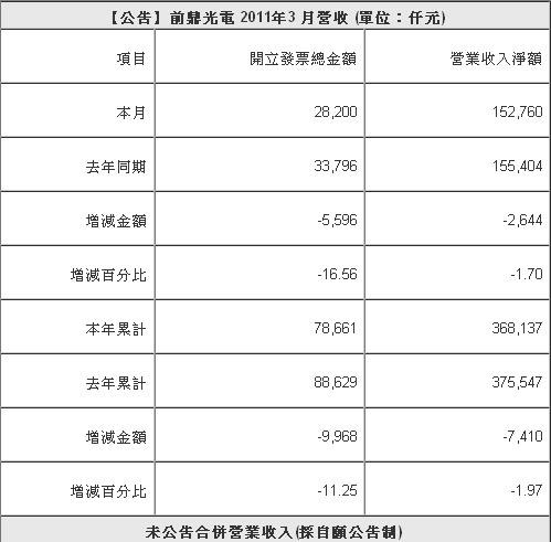 【訊石光通訊咨詢網(wǎng)】4月11日消息,臺(tái)灣前鼎光電(4908)于上周五公布2011年3月份業(yè)績(jī)報(bào)告。報(bào)告顯示,3月份前鼎光電實(shí)現(xiàn)營(yíng)業(yè)收入1.528億元,比2010年同期的1.554億元下降1.70%。其業(yè)績(jī)報(bào)告表如下: