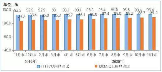 2019年-2020年11月末光纖接入(FTTH/O)和 100Mbps以上接入速率的固定互聯(lián)網(wǎng)寬帶接入用戶占比情況 圖源/工信部