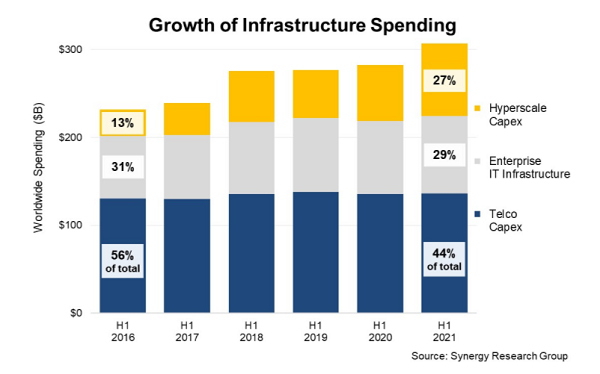 ICC訊(編譯:Nina)Synergy Research的新數(shù)據(jù)顯示,2021年上半年電信資本支出水平再次持平,而超大規(guī)模運營商(Hyperscaler)的資本支出又猛增了30%。與此同時,企業(yè)在IT基礎(chǔ)設(shè)施上的支出略有回升,增長了6%。這些數(shù)字在很大程度上反映了長期趨勢,表明電信公司的資本支出在過去六年中基本保持不變,而超大規(guī)模運營商的支出幾乎翻了三番,企業(yè) IT 基礎(chǔ)設(shè)施支出增長了23%。2021年上半年,這三大集團的基礎(chǔ)設(shè)施支出超過了3000億美元的大關(guān),超大規(guī)模運營商現(xiàn)在占總支出的27%,相比2016年上半年僅占13%。在這六年間,企業(yè)IT基礎(chǔ)設(shè)施支出在總支出中的份額徘徊在30%左右,而電信運營商支出占比從56%下降到44%。