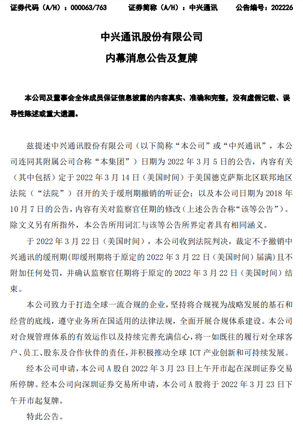 ICC訊 (編輯:Nicole)3月23日消息,中興通訊公告稱:于 2022 年 3 月 22 日(美國時間),公司收到美國法院德克薩斯北區(qū)聯(lián)邦地區(qū)判決,裁定不予撤銷中興通訊的緩刑期(即緩刑期將于原定的 2022 年 3 月 22 日(美國時間)屆滿)且不附加任何處罰,并確認(rèn)監(jiān)察官任期將于原定的 2022 年 3 月 22 日(美國時間)結(jié)束。