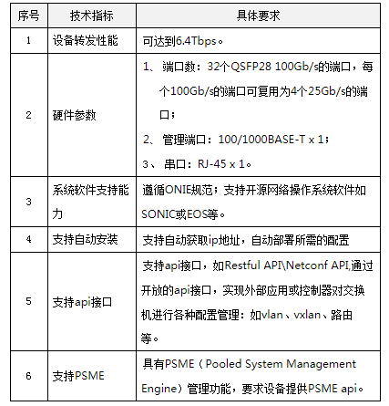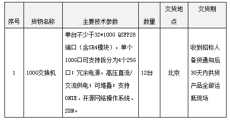 ICCSZ訊 (編輯:Nicole)8月13日,中國電信發(fā)布中國電信云公司2017年研發(fā)測試環(huán)境建設(shè)工程(100G交換機(jī))(重新招標(biāo))招標(biāo)公告(招標(biāo)編號:09-02-04H-2019-D-A00253C01):根據(jù)業(yè)務(wù)開展及技術(shù)測試驗證的需要,需要搭建研發(fā)測試環(huán)境,實現(xiàn)各項研發(fā)測試環(huán)境測試目標(biāo)。本期工程新增100G交換機(jī)(含光模塊、光纖)12臺,作為網(wǎng)絡(luò)接入交換機(jī),在實際驗證高容量接入交換機(jī)使用效果的同時,節(jié)約了機(jī)架空間,減小了占地面積,并簡化數(shù)據(jù)中心核心遷移到100 Gbps 的工作。