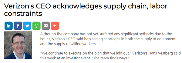 ICC訊(編譯:Nina)據(jù)外媒Light Reading消息,Verizon首席執(zhí)行官表示,他看到設(shè)備供應(yīng)和工人的供應(yīng)都出現(xiàn)短缺,盡管該公司尚未因這些公司而遭受重大挫折。Verizon首席執(zhí)行官Hans Vestberg在近期的一次投資者活動(dòng)中表示,公司將繼續(xù)執(zhí)行之前制定的計(jì)劃,團(tuán)隊(duì)已經(jīng)找到方法。但他表示,Verizon不得不采用“變通方法”來(lái)繼續(xù)建設(shè)其網(wǎng)絡(luò)并為其零售店配備工作人員。