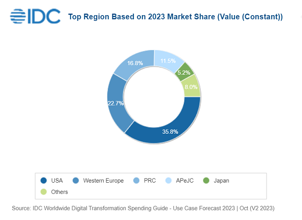 從地理分布來看,2023年,美國將占全球DX支出的35.8%,這一數(shù)字與亞太地區(qū)(包括日本和中國)33.5%的支出份額幾乎相當。歐洲、中東和非洲(EMEA)地區(qū)今年將提供全球26.8%的DX支出。