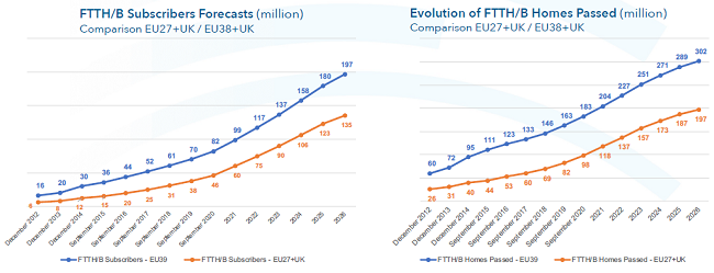 展望未來五年,FTTH歐洲委員會和IDATE DigiWorld的新預(yù)測預(yù)計,到2026年,歐盟39國的FTTH/B家庭覆蓋數(shù)將達3.02億戶,其中EU27+UK將占1.97億戶,這意味著在2021年的數(shù)字上增長67%。