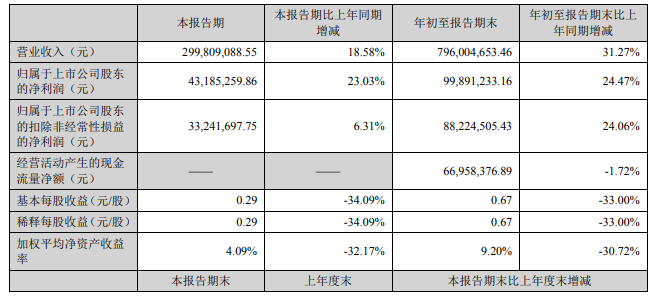ICC訊 (編譯:Anton)10月29日,河北中瓷電子科技股份有限公司公布2021 年第三季度報告,今年第三季度實現(xiàn)營收299,809,088.55元,比上年同期增長18.58%,歸屬于上市公司股東的凈利潤43,185,259.86元,比上年同期增長23.03%;年初至第三季度實現(xiàn)營收796,004,653.46元,比上年同期增長31.27%。歸屬于上市公司股東的凈利潤99,891,233.16,比上年同期增長24.47%。