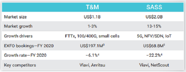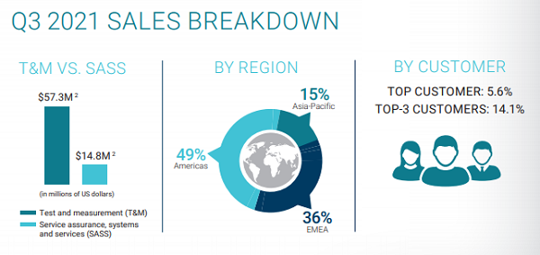 銷售額。2021財年第三季度銷售額同比增長9.8%,這主要是由于2020年冠狀病毒大流行導(dǎo)致投資減少后,美洲和EMEA(歐洲、中東和非洲)的光纖部署支出增加。分部門來看,測試與測量(T&M)銷售額同比增長13.9%,而服務(wù)保障、系統(tǒng)和服務(wù)(SASS)銷售額同比下降9.6%。分區(qū)域來看,美洲地區(qū)銷售額同比增長18.4%,EMEA地區(qū)銷售額同比增長20.6%,但亞太地區(qū)銷售額同比下降23.8%。EXFO的頂級客戶占銷售額的5.6%,前三大客戶占銷售額的14.1%。