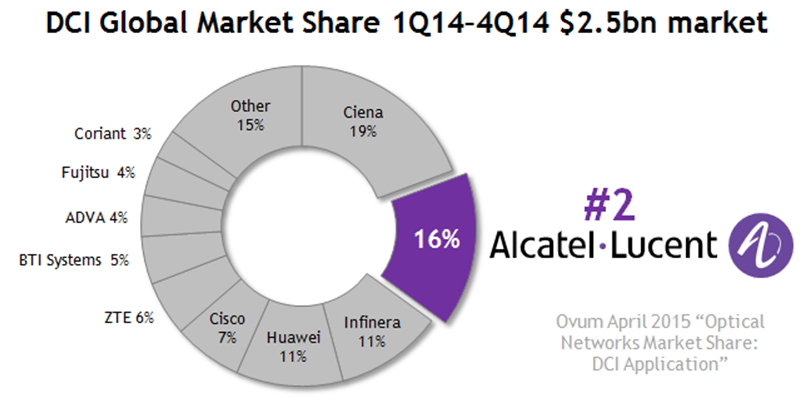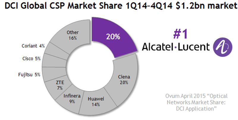 ICCSZ訊 企業(yè)云技術(shù)和消費(fèi)類視頻應(yīng)用給通信市場(chǎng)帶來(lái)了廣泛的影響,使得數(shù)據(jù)中心的數(shù)量強(qiáng)勁增長(zhǎng),并不斷地在新的地理位置上進(jìn)行擴(kuò)張。一個(gè)典型的數(shù)據(jù)中心擁有上千臺(tái)服務(wù)器,這通常需要T比特以上光纖傳輸容量用于數(shù)據(jù)中心之間的互聯(lián)。因此,數(shù)據(jù)中心互聯(lián)(DCI)是光通信網(wǎng)絡(luò)設(shè)備市場(chǎng)增長(zhǎng)最快的應(yīng)用。據(jù)全球著名市場(chǎng)分析機(jī)構(gòu)Ovum的報(bào)告顯示,2014年的DCI市場(chǎng)收入增長(zhǎng)16.2%,達(dá)到25億美元. Ciena、阿爾卡特朗訊和Infinira位列前三甲。在2014年全球的DCI市場(chǎng)中,有近50%的投資來(lái)自于運(yùn)營(yíng)商,阿爾卡特朗訊在這個(gè)重要細(xì)分市場(chǎng)中以20.2%的份額排名第一。