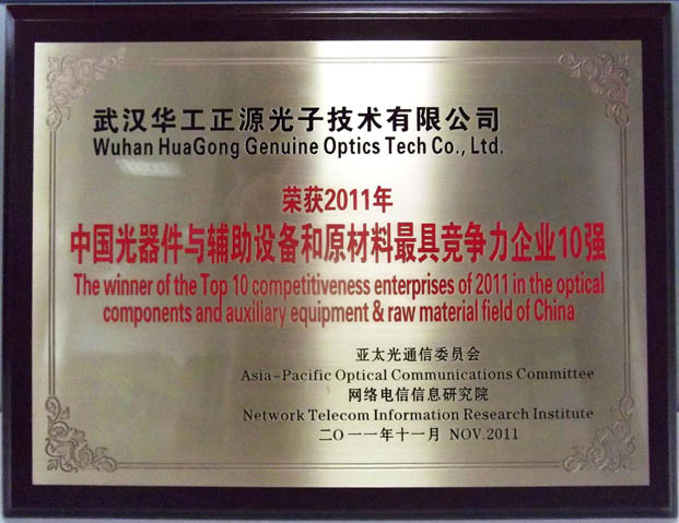 2011年11月23日,中國光通信發(fā)展與競爭力論壇(ODC’2011)在北京召開,論壇開幕式上,20010~2011年度中國光通信最具競爭力企業(yè)10強頒獎儀式隆重舉行,來自中國以及國際光纖光纜、光傳輸、
