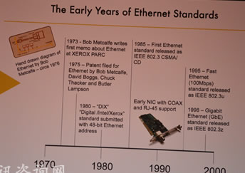 1)早期以太網(wǎng)標(biāo)準(zhǔn):1973年Bob Metcalfe 在XEROX PARC寫(xiě)下了第一個(gè)關(guān)于以太網(wǎng)的備忘錄,1975年申請(qǐng)專利,1980年“DIX”標(biāo)準(zhǔn)(Digital/Intel/Xerox),1985年IEEE 802.3 CSMA/CD公布第一個(gè)因特網(wǎng)標(biāo)準(zhǔn),1990年早期帶COAX的NIC和支持RJ-45,1995年IEEE802.3u公布的快速以太網(wǎng)標(biāo)準(zhǔn)(100Mbps),2000年IEEE802.3z公布的Gigabit Ethernet(GbE)標(biāo)準(zhǔn)。
