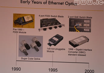 2)早期的以太網(wǎng)光器件:1990年之前FDDI模塊,1990-1995年sugar cube optics,1995年1x9不可插拔模塊,1995-2000年間Gigabit interface converter(GBIC)標(biāo)準(zhǔn)器件。