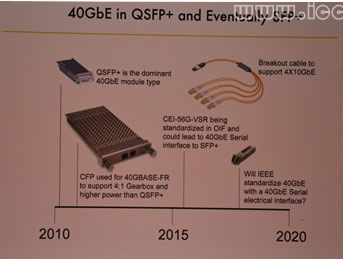 2)QSFP+的40GbE和最終版SFP+:2010年過(guò)后,QSFP+成為40GbE模塊主導(dǎo)形式。隨后用于40GBASE-FR的CFP支持4:1 Gearbox,較QSFP+而言功率更高。預(yù)計(jì)2015年過(guò)后,CEI-56G-VSR將成為OIF標(biāo)準(zhǔn),可能將導(dǎo)致40GbE串行端口轉(zhuǎn)向SFP+。2020年之前,IEEE 40GbE的標(biāo)準(zhǔn)是否會(huì)帶有40GbE串行電端口?突破性的光纜支持4x10GbE。