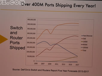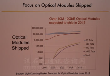 2)聚焦于光模塊的出貨量:光模塊的出貨量包括1G/10G/40G/100G和總的。超過(guò)10M 10GbE光模塊預(yù)計(jì)將在2015年出貨。