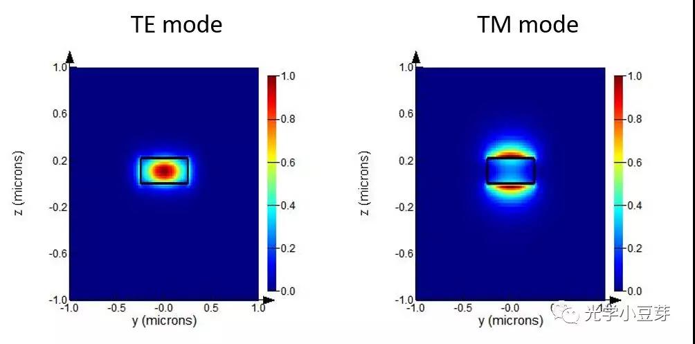 硅波導(dǎo)的典型尺寸為500nm*220nm,這主要是為了滿足單模條件的要求。該尺寸同時(shí)支持TE0模和TM0模式,模場(chǎng)分布如下圖所示,