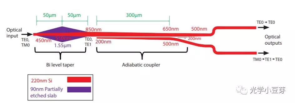 利用bi-level taper, 使得TM0模式轉(zhuǎn)換為TE1模式,進(jìn)而利用不對(duì)稱的定向耦合器,使得TE1模式轉(zhuǎn)變?yōu)門E0模式。典型的結(jié)構(gòu)如下圖所示,