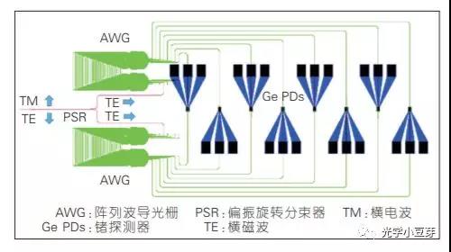 基于PSR, 人們提出了polarization diversity的方案,也就是在兩個(gè)輸出端口連接相同的接收光路,如下圖所示。該方案將同一光路復(fù)制兩份,芯片的尺寸增大一倍。