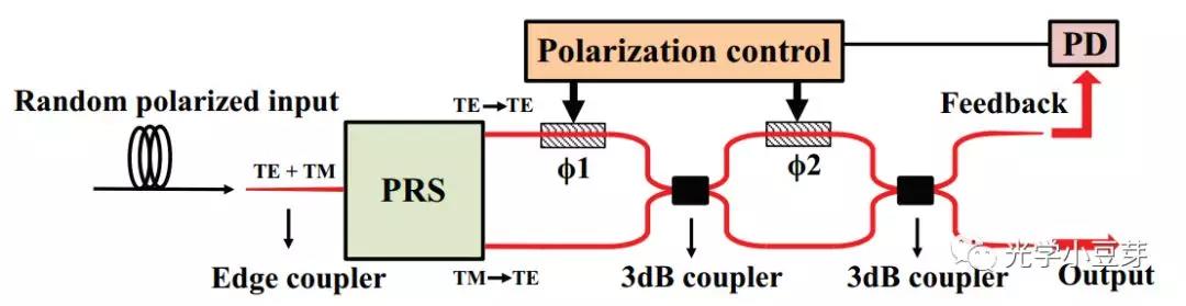 另外一種方案是基于MZI進(jìn)行反饋控制,使得兩路中的TE模式進(jìn)行干涉,最終光場(chǎng)全部集中在一根波導(dǎo)中,如下圖所示。該方案需要設(shè)計(jì)反饋控制算法。