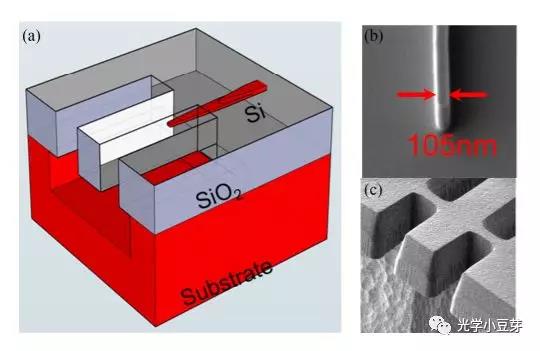 此外偏振不敏感的edge coupler也是其中的一個(gè)關(guān)鍵器件,典型的結(jié)構(gòu)為懸臂梁型端面耦合器, 硅波導(dǎo)的tip寬度為90nm左右,如下圖所示,