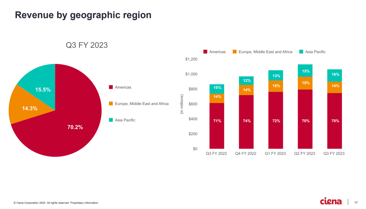 2023財(cái)年第三季度,Ciena營(yíng)收為10.68億美元,去年同期為8.68億美元,同比增長(zhǎng)23%。2023財(cái)年三季度毛利率為42%,去年同期為39.3%,同比增長(zhǎng)2.7%。2023財(cái)年三季度凈收入2973.3萬(wàn)美元,每股收益0.2美元,去年同期凈收入1051.2萬(wàn)美元,每股收益0.07美元。