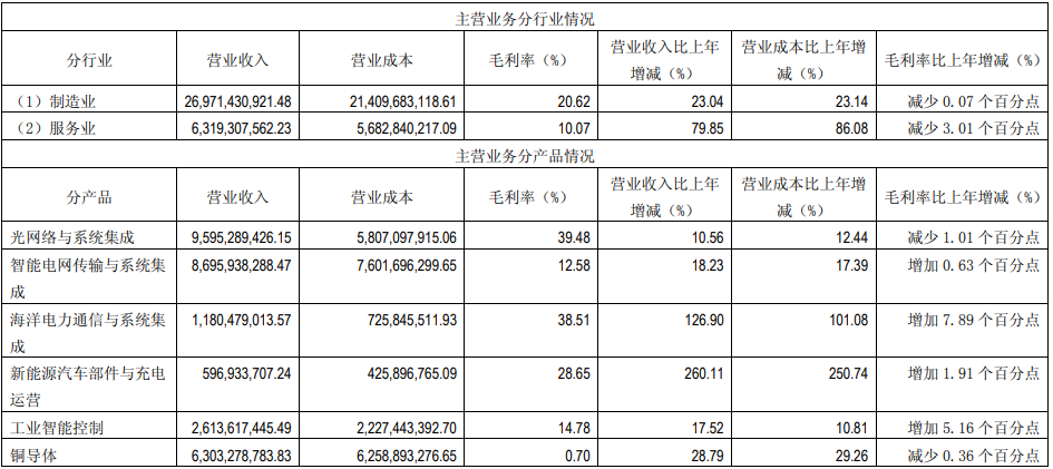 分主要產(chǎn)品看,光網(wǎng)絡(luò)與系統(tǒng)集成營收95.95億元,同比增長10.56%,毛利率為39.48%;智能電網(wǎng)傳輸與系統(tǒng)集成營收86.96億元,同比增長18.23%,毛利率為12.58%;海洋電力通信與系統(tǒng)集成營收11.8億元,同比增長126.9%,毛利率為38.51%;工業(yè)智能控制營收26.14億元,同比增長17.52%,毛利率為14.78%;銅導(dǎo)體營收63億元,同比增長28.79%,毛利率為0.7%;商品貿(mào)易營收39.78億元,同比增長179.13%。