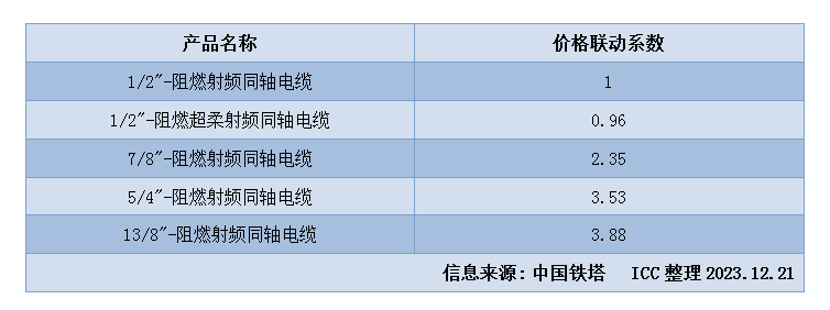 此外,本項目設(shè)置最高投標(biāo)限價,投標(biāo)人投標(biāo)報價高于最高投標(biāo)限價的,其投標(biāo)將被否決。基準(zhǔn)型號產(chǎn)品(1/2"-阻燃射頻同軸電纜)最高投標(biāo)限價為9.33元/米(不含稅),其他型號價格聯(lián)動系數(shù)詳見下表: