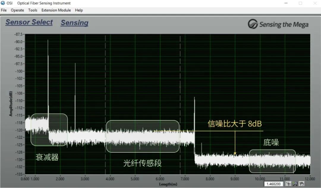 測試前先判斷光纖鏈路損耗是否在合理范圍內(nèi)。若鏈路有少量損耗且信噪比大于8dB,OSI傳感測量不受影響,若信噪比低于8dB,此時系統(tǒng)可測的應(yīng)變范圍有所下降,建議查找原因、排除故障、降低損耗后再測試。