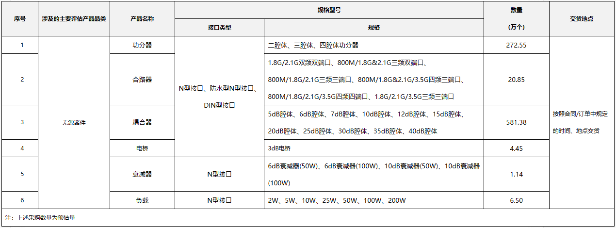 ICC訊 中國(guó)電信啟動(dòng)無(wú)源器件(2023年)集中采購(gòu)項(xiàng)目,采購(gòu)內(nèi)容為中國(guó)電信集團(tuán)有限公司和中國(guó)電信股份有限公司及其下屬子公司、分公司在2023年至2025年各工程中所需的無(wú)源器件產(chǎn)品,主要包括功分器、合路器、耦合器、電橋、衰減器、負(fù)載六大類,預(yù)估采購(gòu)數(shù)量為886.87萬(wàn)個(gè)。