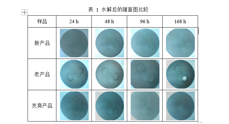 將研磨后的大模場(chǎng)器件用保偏光纖端面裸露在高溫高濕(85℃,85%RH)環(huán)境下定期觀察。分別觀察24h,48 h,96h和168 h時(shí)光纖端面的水解情況,每種光纖取典型的端面如表1所示??梢钥闯?,老產(chǎn)品出現(xiàn)端面應(yīng)力區(qū)水解的情況,新產(chǎn)品在水解方面,性能與友商相同,甚至更好。