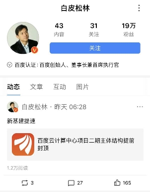 摘要:6月1日,百度云計(jì)算(陽(yáng)泉)中心項(xiàng)目二期順利封頂,比原計(jì)劃提前20多天。百度董事長(zhǎng)兼CEO李彥宏在其百家號(hào)動(dòng)態(tài)中轉(zhuǎn)發(fā)該消息并評(píng)論稱(chēng):新基建提速。