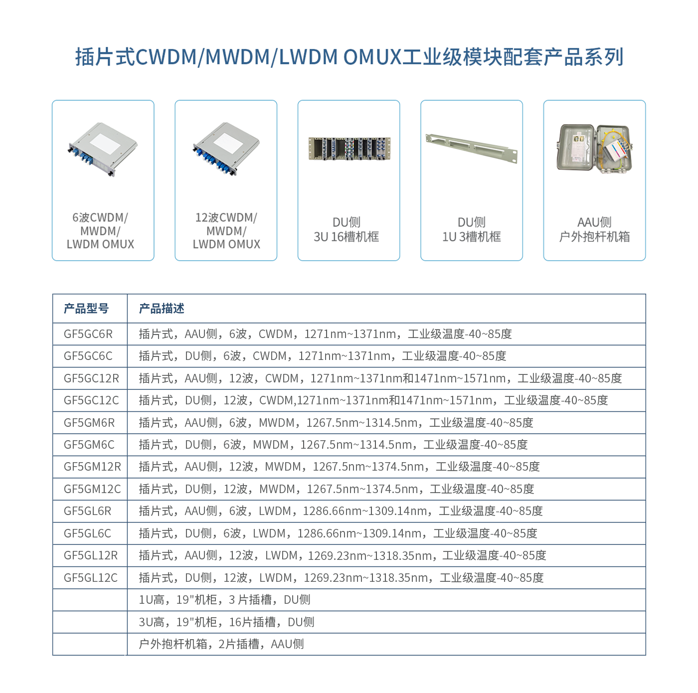 此外,插片式模塊產(chǎn)品易安裝,可以獨(dú)立使用,也可搭配機(jī)框和戶外抱桿機(jī)箱使用。以下完整的CWDM/MWDM/LWDM解決方案,起浪光纖都可提供。