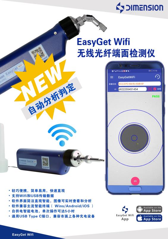 EasyGet Wifi是最輕巧便攜的無線光纖端檢儀,通過Wifi實(shí)現(xiàn)和多種智能終端間實(shí)時(shí)傳輸視頻、拍照、存儲(chǔ)等,用戶可以直觀地查看光纖端面質(zhì)量,升級(jí)后新增自動(dòng)分析判定功能,用戶可以免費(fèi)升級(jí)應(yīng)用,使其成為現(xiàn)場(chǎng)技術(shù)人員最實(shí)用的光纖端面檢測(cè)工具。