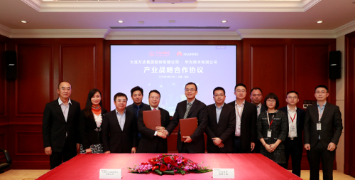 萬達集團 CIO 朱戰(zhàn)備(左五)與華為公司戰(zhàn)略部總裁張文林(左六)簽署5G產(chǎn)業(yè)戰(zhàn)略合作協(xié)議