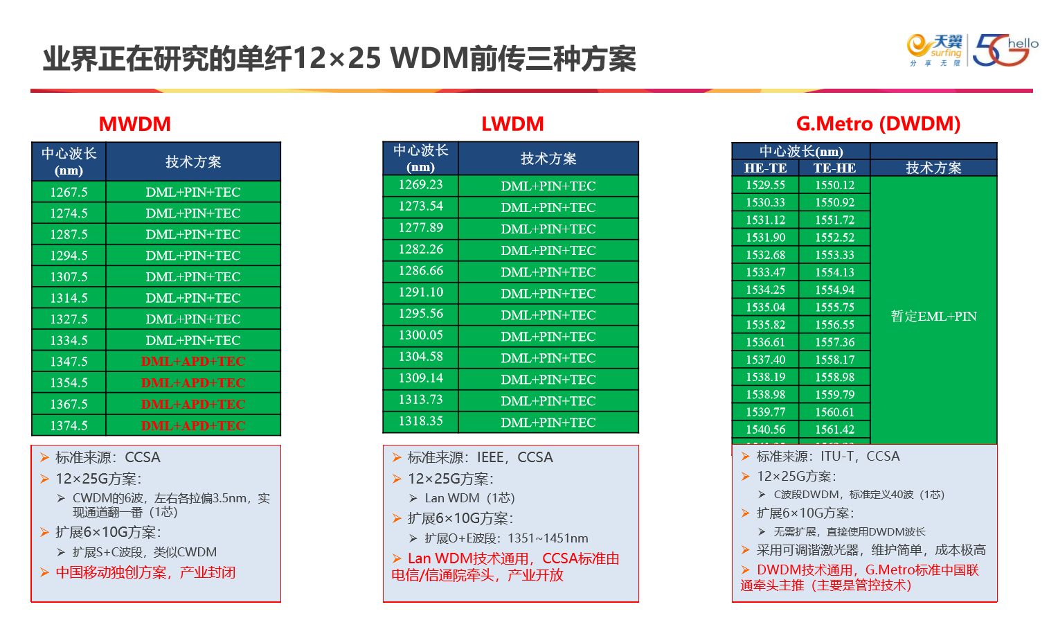 除此之外,業(yè)界正在研究的單纖12×25 WDM前傳三種方案為:由中國移動(dòng)主導(dǎo),產(chǎn)業(yè)封閉的MWDM(中等波分復(fù)用)方案;中國電信+信通院聯(lián)合牽頭,產(chǎn)業(yè)開放的LWDM(細(xì)波分復(fù)用);中國聯(lián)通主導(dǎo)的G.Metro(DWDM密集波分復(fù)用),三種方案各具特點(diǎn)。