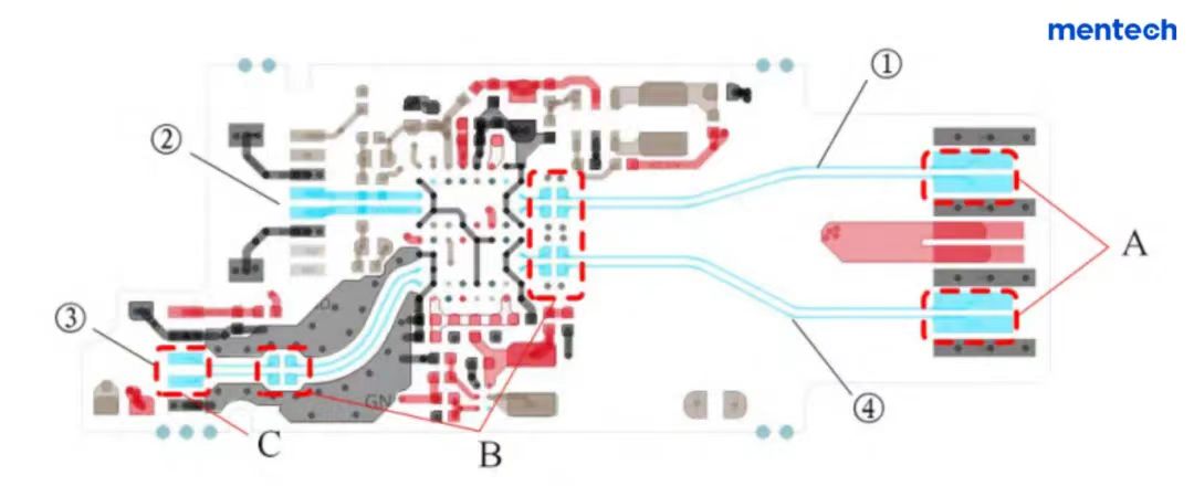 發(fā)射與接收軟板設(shè)計:發(fā)射軟板采用微帶線結(jié)構(gòu)設(shè)計,接收軟板則采用接地共面波導(dǎo)結(jié)構(gòu)設(shè)計,并通過精細(xì)的打孔設(shè)計減少輻射損耗和抑制高次模分量,降低空間串?dāng)_,確保信號傳輸?shù)募儍襞c穩(wěn)定。