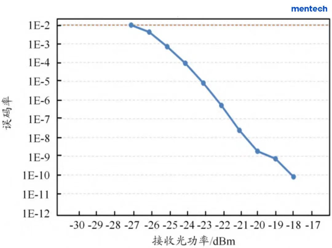 在1E-2誤碼率條件下,接收靈敏度達(dá)到-27dBm,優(yōu)于IEEE802.3ca協(xié)議要求的-24dBm,且串?dāng)_小于0.5dB。