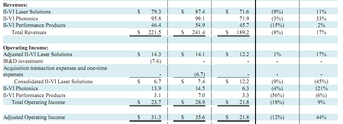 確實,II-VI在新財年第一季度表現(xiàn)非常強勁,公司實現(xiàn)營收2.21億美元(以下貨幣單位均為美元),同比增長17%,環(huán)比下降8%,超過投資者的原有預期。盡管GAAP凈收入為1630萬元,同比下降5%,環(huán)比增長14%,不過審核多個因素后,凈收入調(diào)整為2250萬元,同比增長31%,環(huán)比增長8%。每股盈利調(diào)整為0.35元/股,比投資者預期高0.08元??傮w上,II-VI延續(xù)了自上一季度以來的良好勢頭。