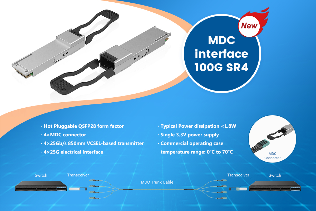 愛德泰100G SR4 QSFP光模塊包含一個(gè)MDC插座,可以插入4個(gè)MDC雙T連接器,這一設(shè)計(jì)可以在MDC電纜組件上將100G的傳輸路徑分成4個(gè)25G的傳輸,目不需要額外的分線電纜或模塊。另外,MDC連接器的陶瓷卡套的插入損耗為0.15dB,低干MT卡套的標(biāo)準(zhǔn)插入損耗(0.35dB),可以給通信路徑提供更多的插入損耗空間。
