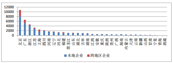 目前,全國增值電信業(yè)務(wù)市場(chǎng)區(qū)域發(fā)展不均衡特征突出。在 7871 家跨地區(qū)企業(yè)中,注冊(cè)地在北京的 2719 家,廣東的 1432 家,上海的 820 家,三地集中了 63.2%的跨地區(qū)企業(yè)。部分西部地區(qū)的跨地區(qū)企業(yè)數(shù)仍停留在個(gè)位數(shù)字。在 38761 家本地企業(yè)中,北京 8083 家,廣東 5223 家,北京、廣東兩地的增值電信企業(yè)數(shù)量在全國遙遙領(lǐng)先,接下來依次是浙江、江蘇、四川、上海等,6 地集中了全國 62.1% 的增值電信企業(yè),西部 12 省份的增值電信業(yè)務(wù)經(jīng)營者僅占全國的 12.6%。