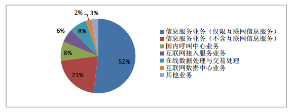 按照 2015 版《電信業(yè)務(wù)分類目錄》中增值電信業(yè)務(wù)分類, 46632 家增值電信企業(yè)合計(jì)擁有 57150 個(gè)許可項(xiàng)目。其中,29644 個(gè)信息服務(wù)業(yè)務(wù)(僅限互聯(lián)網(wǎng)信息服務(wù)),12006 個(gè)信息服務(wù)業(yè)務(wù)(不含互聯(lián)網(wǎng)信息服務(wù)),4746 個(gè)國內(nèi)呼叫中心業(yè)務(wù),4293 個(gè)在線數(shù)據(jù)處理與交易處理業(yè)務(wù),3411 個(gè)互聯(lián)網(wǎng)接入服務(wù)業(yè)務(wù)(以下簡稱 ISP),1417 個(gè)互聯(lián)網(wǎng)數(shù)據(jù)中心業(yè)務(wù)(以下簡稱 IDC),其他業(yè)務(wù) 1598 個(gè)。