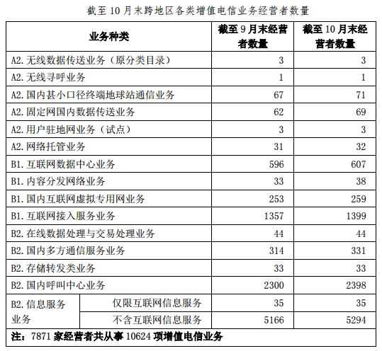 截止10月底全國增值電信業(yè)務(wù)經(jīng)營許可企業(yè)共46632家