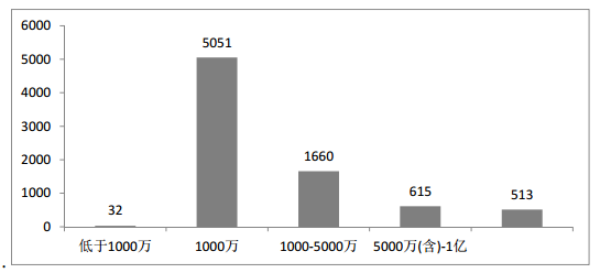 不同經(jīng)營者間注冊(cè)資金規(guī)模差異較大,但仍以注冊(cè)資金在 1000 萬元人民幣的經(jīng)營者居多。在目前部頒 7871 家經(jīng)營者中,注冊(cè)資金為 1000 萬元人民幣的經(jīng)營者占經(jīng)營者總數(shù)的 64.2%,注冊(cè)資金在 1000 萬元到 5000 萬元人民幣之間的經(jīng)營者占經(jīng)營者總數(shù)的 21.1%,注冊(cè)資金在 5000 萬元(含)到 1 億元人民幣之間的經(jīng)營者占經(jīng)營者總數(shù)的 7.8%,注冊(cè)資金超過 1 億元人民幣的大型企業(yè)占經(jīng)營者總數(shù)的 6.5%,詳見下圖 。