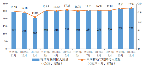 移動(dòng)互聯(lián)網(wǎng)流量較快增長(zhǎng),11月DOU值創(chuàng)年內(nèi)新高。1-11月份,移動(dòng)互聯(lián)網(wǎng)累計(jì)流量達(dá)2728億GB,同比增長(zhǎng)14.6%。截至11月末,移動(dòng)互聯(lián)網(wǎng)用戶數(shù)達(dá)15.1億戶,比上年末凈增5611萬(wàn)戶。11月當(dāng)月戶均移動(dòng)互聯(lián)網(wǎng)接入流量(DOU)達(dá)到17.99GB/戶·月,同比增長(zhǎng)8.5%,較上年12月份高1.81GB/戶·月。