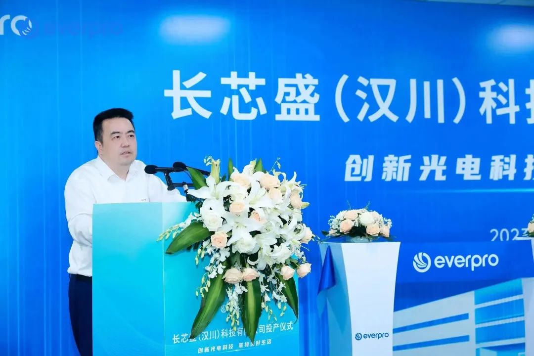 投產(chǎn)儀式現(xiàn)場(chǎng),孝感市政府副市長(zhǎng)、漢川市委書記黃建軍,長(zhǎng)飛公司執(zhí)行董事兼總裁莊丹,長(zhǎng)芯盛(武漢)科技有限公司總經(jīng)理湯金寬分別致辭,儀式由長(zhǎng)飛公司副總裁鄭昕主持。