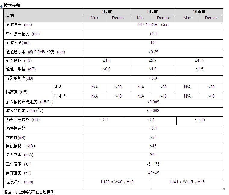 密集波分復(fù)用器是將不同波長(zhǎng)的光信號(hào)復(fù)用至一根光纖上(復(fù)用),或?qū)?fù)用在一根光纖中的多個(gè)光信道按波長(zhǎng)分開(kāi)(解復(fù)用).100G信道間隔密集光波分復(fù)用器/解復(fù)用器采用成熟的多腔介質(zhì)膜實(shí)現(xiàn)光的濾波,波長(zhǎng)穩(wěn)定性好,采用密封工藝封裝,環(huán)境穩(wěn)定性高.
