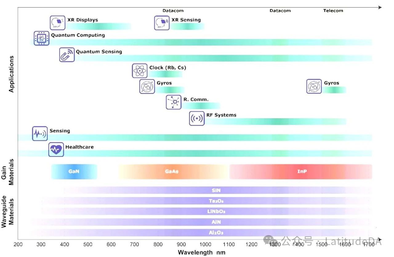 用于無源波導(dǎo)的材料平臺(tái)選擇對實(shí)現(xiàn)所需波長范圍內(nèi)的低損耗光傳播非常重要。圖1介紹各種材料體系與目標(biāo)應(yīng)用/波長和可用的光譜帶的匹配情況。