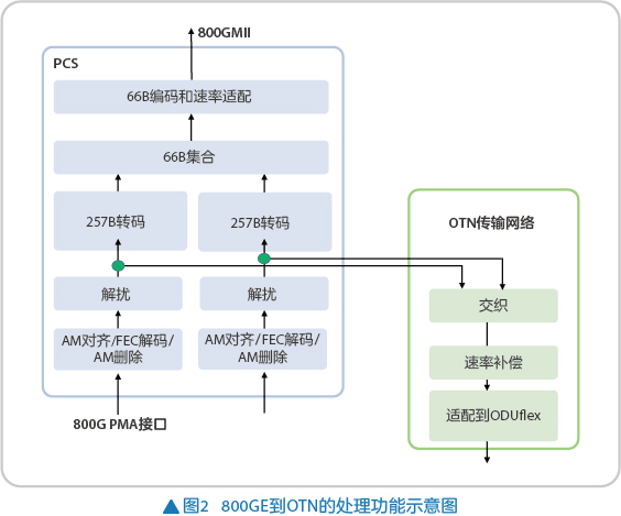 在第一階段的工作,ITU-T SG15 Q11已經(jīng)達成了諸多共識。在承載IEEE802.3規(guī)范的800GE客戶業(yè)務方面,確定了ODUflex(800G)速率以及800GE到OTN映射的參考點,從800GE以太網(wǎng)接口恢復的2條257B格式的數(shù)據(jù)流,按照257B的粒度進行交織形成一條數(shù)據(jù)流。同時為了解決257B帶來的對齊和MTTFPA(mean time to false packet acceptance)問題,將ODUflex 4×3808行凈荷劃分為整數(shù)倍的257B塊和38bit的填充,其中32bit用于承載CRC32完成相關錯誤標記功能。為了簡化ODUflex和以太接口時鐘的倍頻關系,還需要對該條257B數(shù)據(jù)流進行速率補償,以彌補在800GE以太網(wǎng)處理中刪除的AM速率。對比400GE而言,為了節(jié)省傳輸帶寬,并拉近以太業(yè)務速率和OTN速率之間的差距,加大以太業(yè)務和OTN速率使用相同模塊的可能,800GE到OTN映射參考點由66B碼流變更為257B碼流。從800GE PMA接口到OTN傳輸網(wǎng)的處理功能如圖2所示。