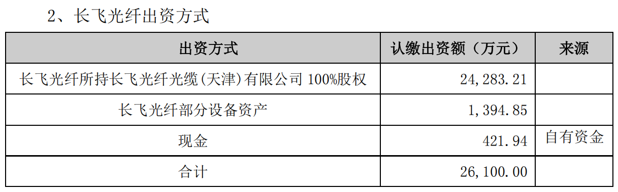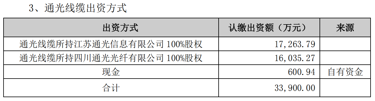 根據(jù)公告可知,合資公司注冊資本為6億元。其中,通光線纜持股56.5%,以旗下全資子公司江蘇通光信息有限公司、四川通光光纖有限公司的股權(quán)及現(xiàn)金出資,合計3.39億元;長飛光纖持股43.5%,以長飛光纖光纜(天津)有限公司股權(quán)、設(shè)備資產(chǎn)及現(xiàn)金出資,合計2.61億元。本次交易完成后,合資公司將會成為公司控股子公司,納入公司合并報表范圍。