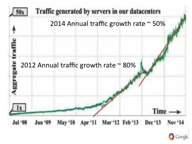 Google的數(shù)據(jù)說明在過去7年流量增長了50倍,相當于平均年增長率75%--大大高于全球互聯(lián)網(wǎng)流量的增長。然而,這些數(shù)據(jù)也顯示2014年流量增長率大約是50%--低于2012年的80%的增長率(圖中的兩根紅線是LightCounting加的)。