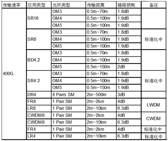 在進(jìn)行400GE布線鏈路設(shè)計(jì)時(shí),需要考量400GE應(yīng)用的傳輸距離和鏈路損耗等要求,傳輸距離和鏈路損耗要符合如下技術(shù)要求。表:源于ISO/IEC TR 11801-9908草案,各MSA及IEEE系列標(biāo)準(zhǔn)要求